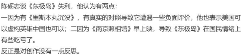 离谱的是,当时现场还有不少电影人没有意识到问题,例如陈砺志说《东极岛》票房扑街,竟然责怪起了《南京照相馆》,说《南京照相馆》利用国民情绪↓