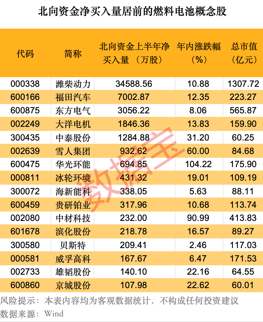 二季度末16只燃料电池概念股获北向资金净买入超百万股天宇优配 二季度末16只燃料电池概念股获北向资金净买入超百万股