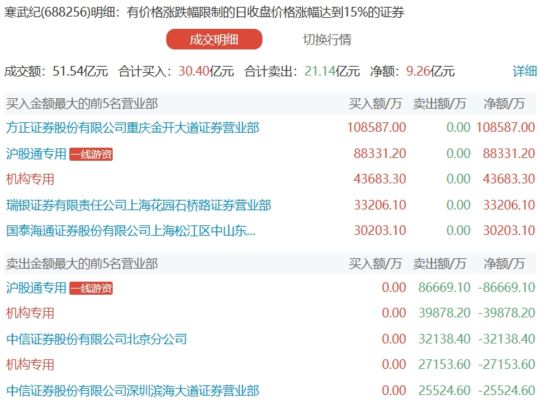 寒武纪今日涨停 涪陵广场路席位净买入10.86亿元寒武纪今日涨停 涪陵广场路席位净买入10.86亿元