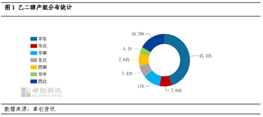 本月乙二醇产能基数在3074.2万吨。四川正达凯一期60万吨/年乙二醇装置5月试车成功,2025年6月3日计入产能基数,中国乙二醇行业产能提升至3074.2万吨。从区域占比来看,华东地区仍为最主要生产地区,目前占全国总产能45.42%。