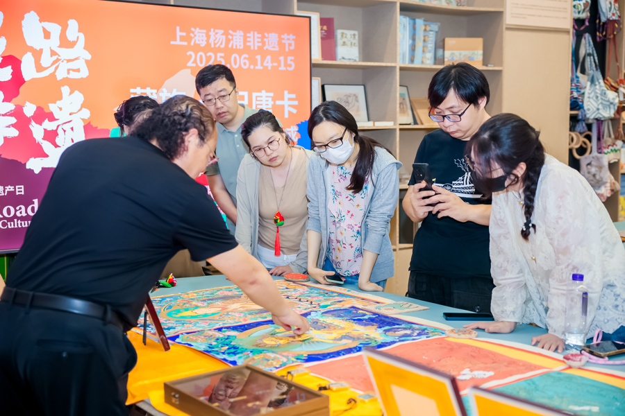 除了舞台表演,非遗工坊也在多地同步开展。6月14日至15日,来自甘肃的六位非遗传承人走进杨浦文化艺术中心、敦煌当代美术馆和杨浦区少年宫,为市民带来包括庆阳香包刺绣、会宁剪纸、兰州刻葫芦、天祝唐卡、通渭麦秆画、古法蓝染等极具地域特色的非遗技艺体验。
