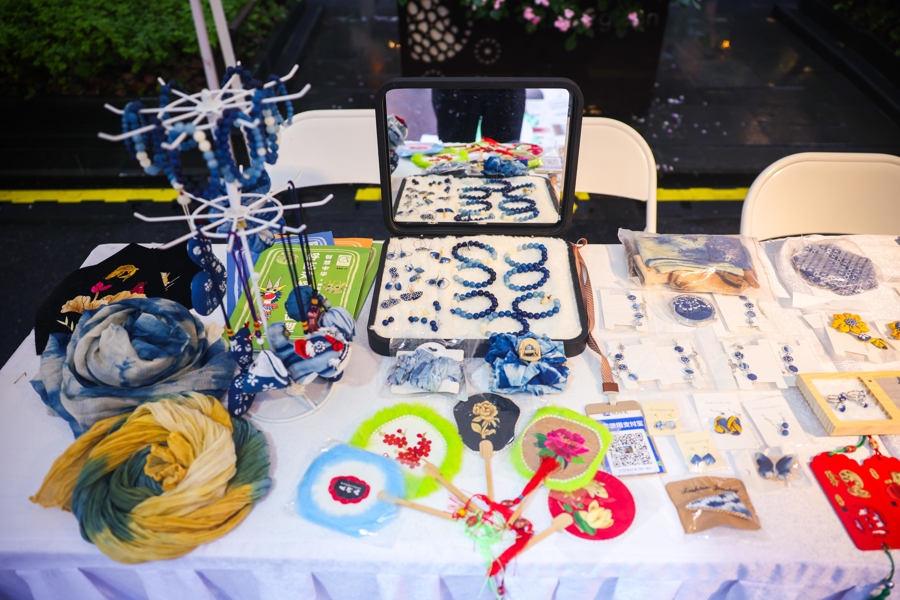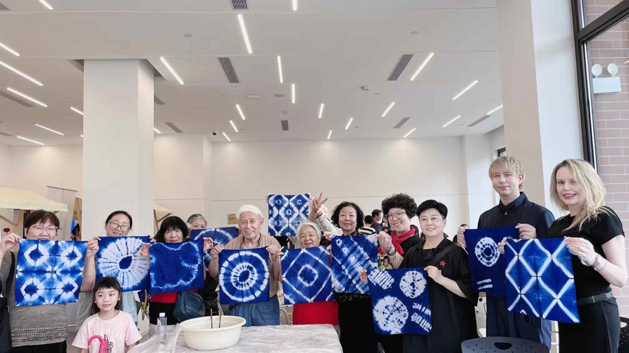 在缝制和刺绣香包时, 庆阳香包刺绣的传承人邹叶叶分享:“这次带来的作品有创新,比如把香包与包包,帽子与虎文化和龙文化融合,让它更时尚、雅致、大气自然。虽然表现形式变了,但文化符号没有变。”非遗传承人李梅引导大家用古法蓝染勾勒想象的形状,染出的每一块布都不同,如水中倒影又如云卷云舒。